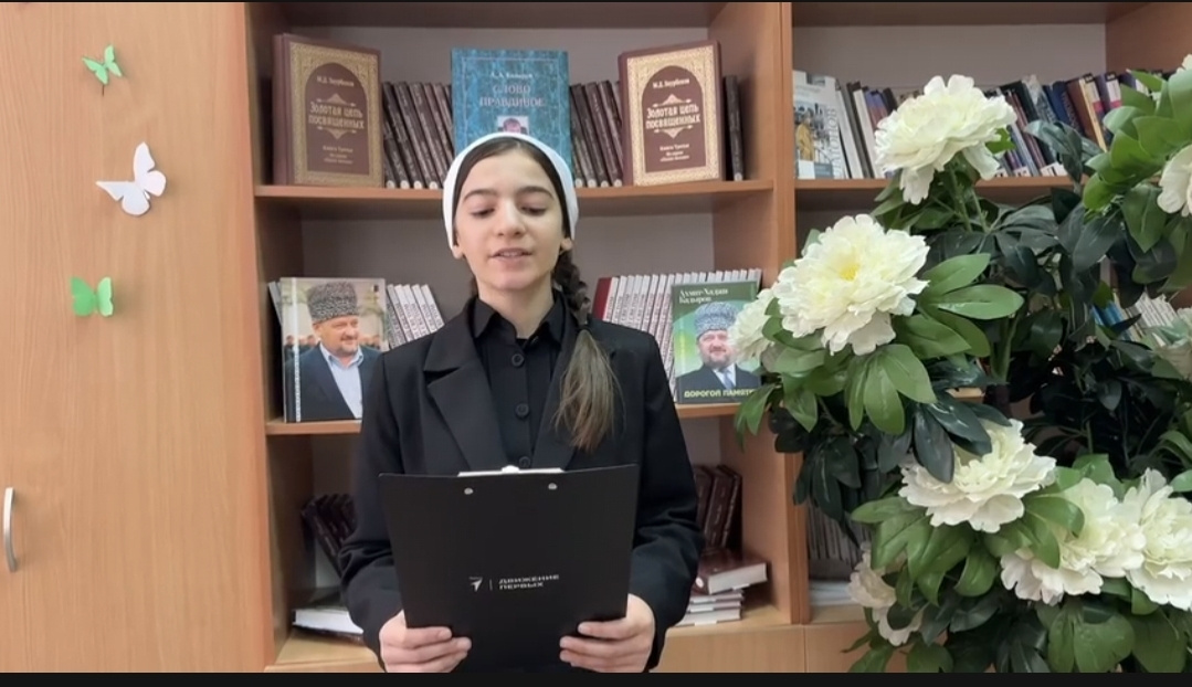 В рамках конкурса МОПД «Ахмат» ученица 7 «Б» класса МБОУ «СОШ №5 с. Гехи» Расламбекова Аймани представила биографию первого президента Чеченской Республики, героя России Ахмат-Хаджи Кадырова.